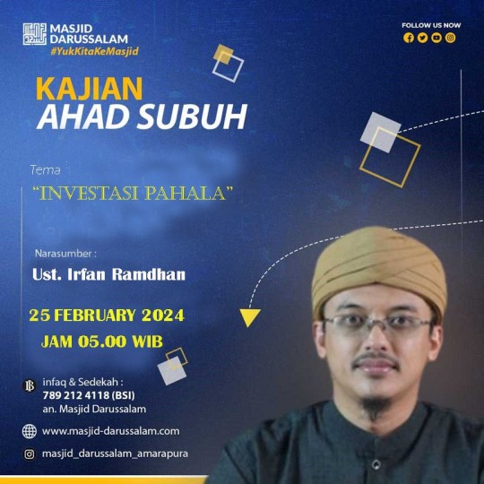 DKM Darussalam mengundang Bapak/Ibu Muslimin/at Jamaah Masjid Darussalam untuk hadir Sholat Subuh Berjamaah dan Kajian Ba’da Subuh