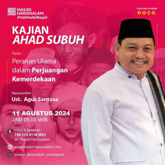 DKM Darussalam mengundang Bapak/Ibu Muslimin/at Jamaah Masjid Darussalam untuk hadir Sholat Subuh Berjamaah dan Kajian Ba’da Subuh
