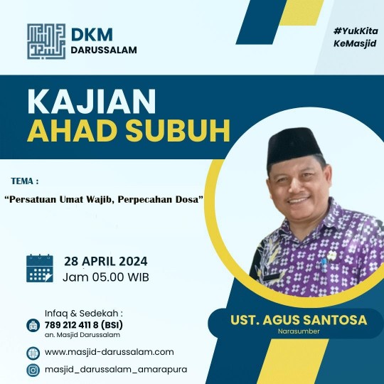 DKM Darussalam mengundang Bapak/Ibu Muslimin/at Jamaah Masjid Darussalam untuk hadir Sholat Subuh Berjamaah dan Kajian Ba’da Subuh