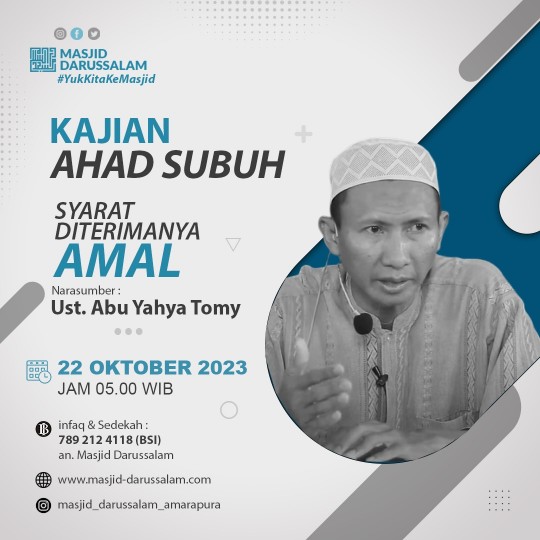 DKM Darussalam mengundang Bapak/Ibu Muslimin/at Jamaah Masjid Darussalam untuk hadir Sholat Subuh Berjamaah dan Kajian Ba’da Subuh