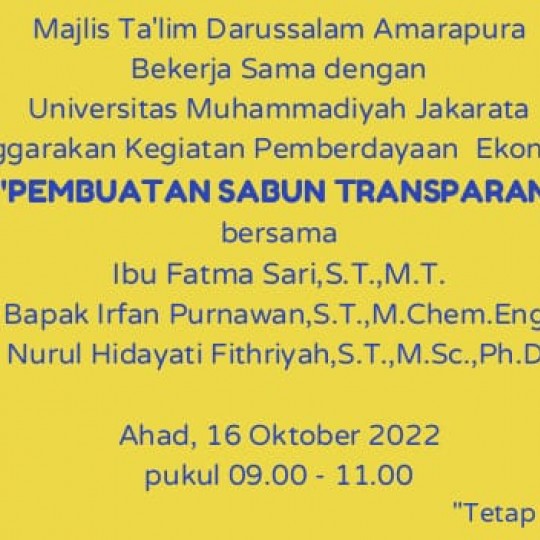 Kami dari MT Darussalam Amarapura bekerjasama dengan Universitas Muhammadiyah Jakarta akan menyelengggarakan Kegiatan Pemberdayaan Ekonomi Umat "Pembuatan Sabun Transparan" yang in Syaa Allah akan dilaksanakan :