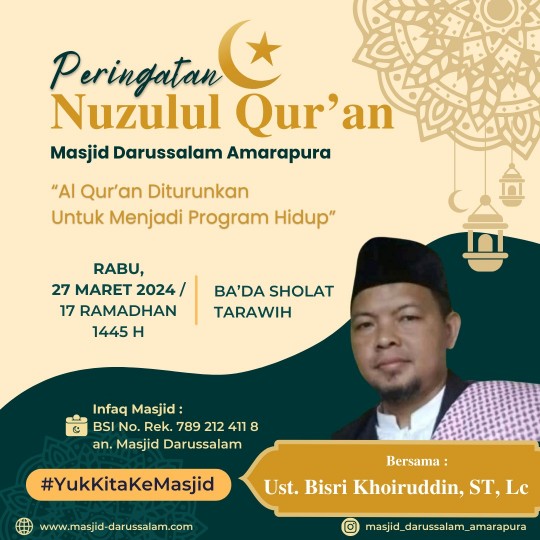 DKM Darussalam mengundang Bapak/Ibu Muslimin/at Jamaah Masjid Darussalam untuk menghadiri Peringatan Nuzulul Qur'an 1445 H