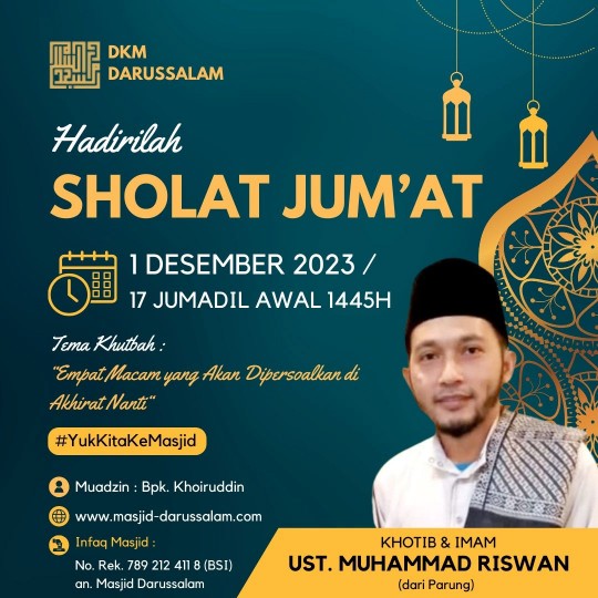 DKM Darussalam mengundang Jamaah Masjid Darussalam untuk menghadiri Sholat Jumat dengan :