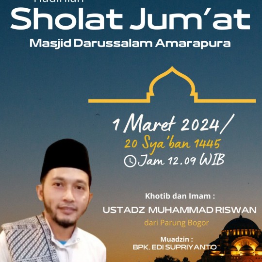 DKM Darussalam mengundang Jamaah Masjid Darussalam untuk menghadiri Sholat Jumat dengan :