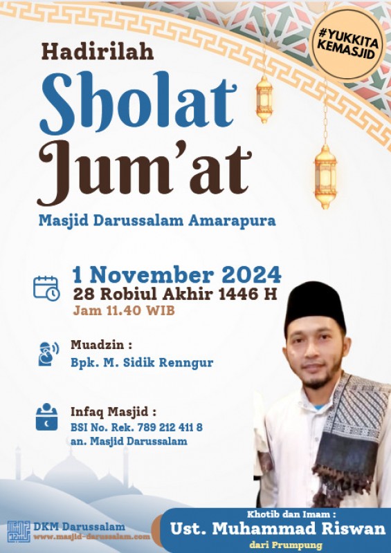 DKM Darussalam mengundang Jamaah Masjid Darussalam untuk menghadiri Sholat Jumat dengan :