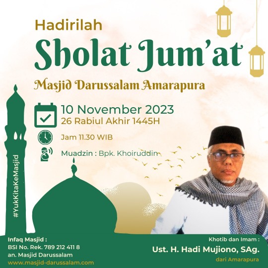 DKM Darussalam mengundang Jamaah Masjid Darussalam untuk menghadiri Sholat Jumat dengan :