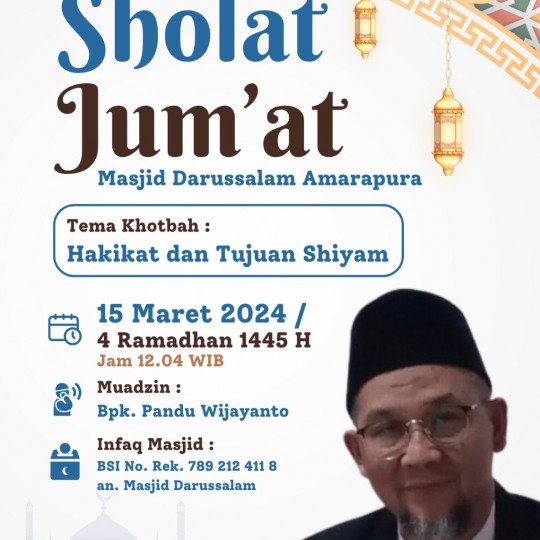 DKM Darussalam mengundang Jamaah Masjid Darussalam untuk menghadiri Sholat Jumat dengan :