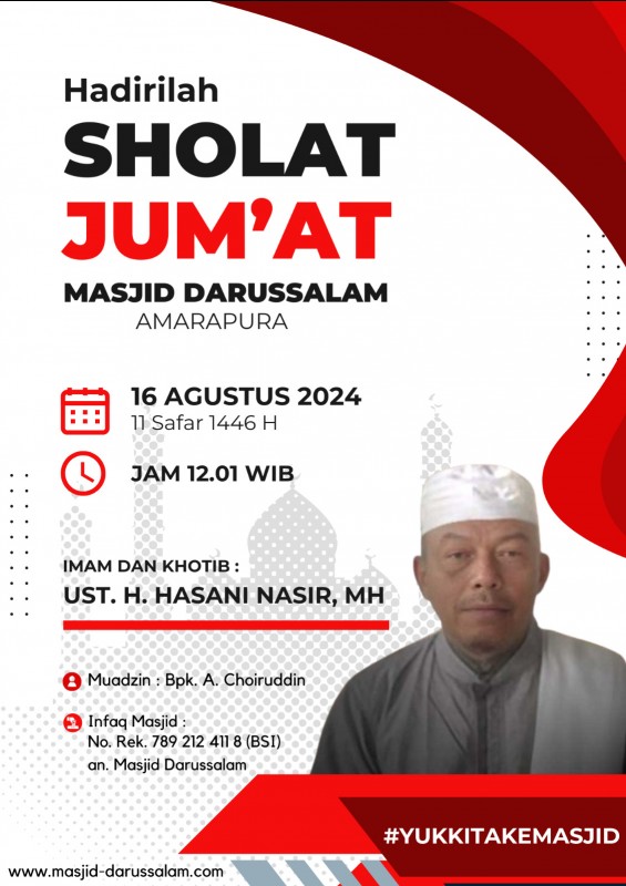 DKM Darussalam mengundang Jamaah Masjid Darussalam untuk menghadiri Sholat Jumat dengan :