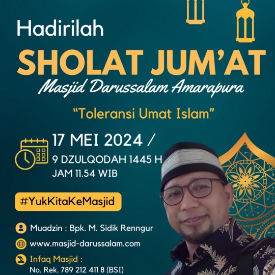 DKM Darussalam mengundang Jamaah Masjid Darussalam untuk menghadiri Sholat Jumat dengan :