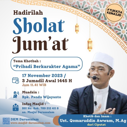 DKM Darussalam mengundang Jamaah Masjid Darussalam untuk menghadiri Sholat Jumat dengan :