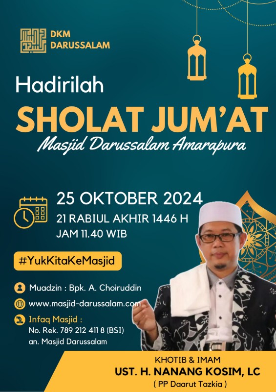 DKM Darussalam mengundang Jamaah Masjid Darussalam untuk menghadiri Sholat Jumat dengan :