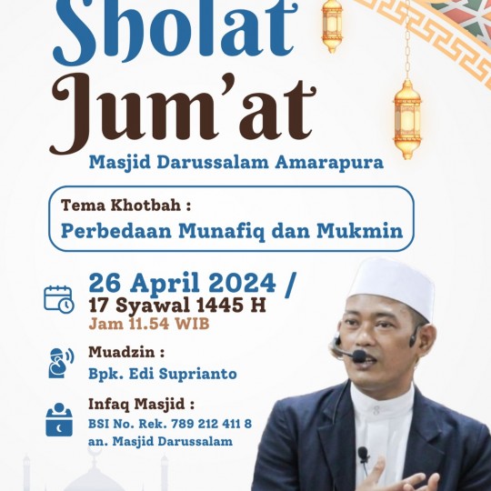 DKM Darussalam mengundang Jamaah Masjid Darussalam untuk menghadiri Sholat Jumat dengan :