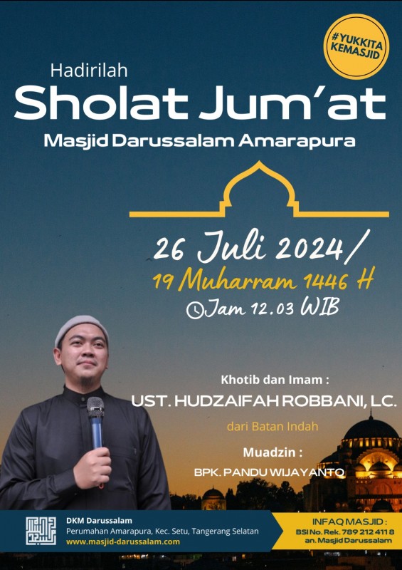 DKM Darussalam mengundang Jamaah Masjid Darussalam untuk menghadiri Sholat Jumat dengan :