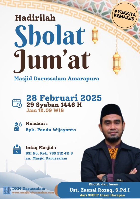 DKM Darussalam mengundang Jamaah Masjid Darussalam untuk menghadiri Sholat Jumat dengan :