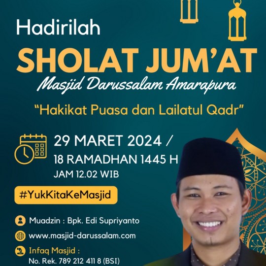 DKM Darussalam mengundang Jamaah Masjid Darussalam untuk menghadiri Sholat Jumat dengan :