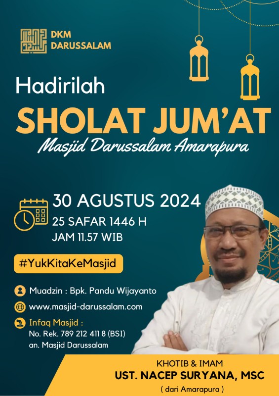 DKM Darussalam mengundang Jamaah Masjid Darussalam untuk menghadiri Sholat Jumat dengan :