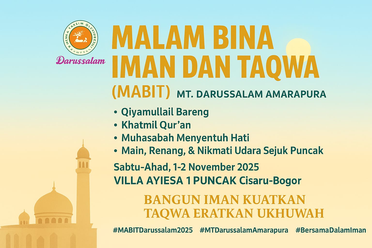 MT. Darussalam Amarapura kembali menyelenggarakan kegiatan Malam Bina Iman dan Taqwa (MABIT) sebagai bentuk pembinaan ruhiyah serta penguatan ukhuwah antar jamaah. Kegiatan ini dilaksanakan selama dua hari dengan mengusung suasana kebersamaan, kehangatan iman, serta muhasabah dalam suasana alam yang sejuk.